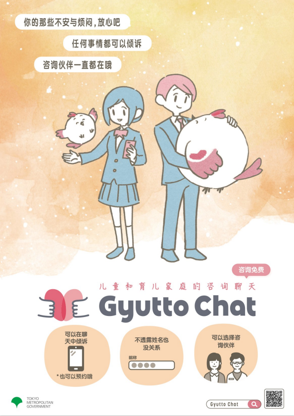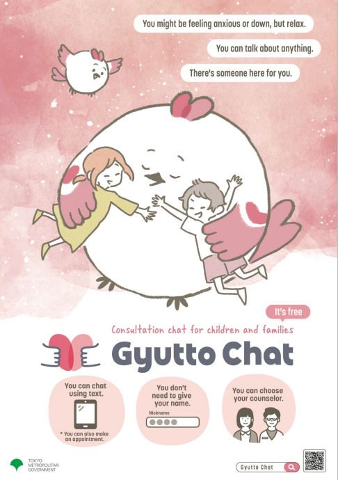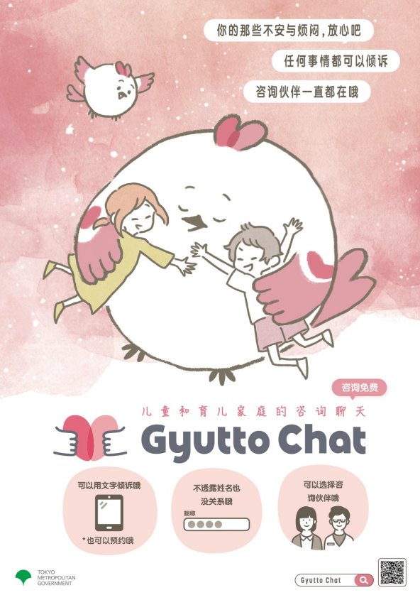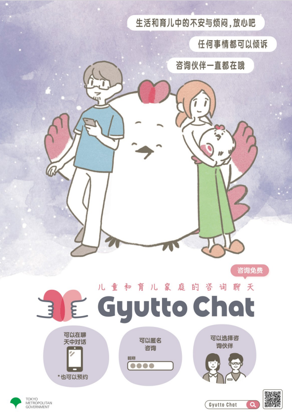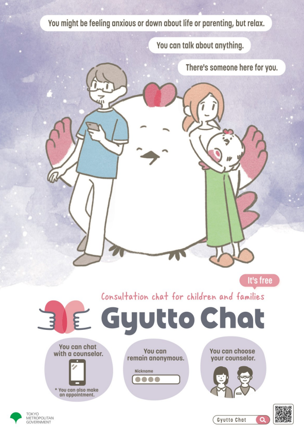 「ギュッとチャット」はSNS等を活用し、子供や子育て家庭が日常的な不安や悩みを気軽に話せる無料の相談チャットです。